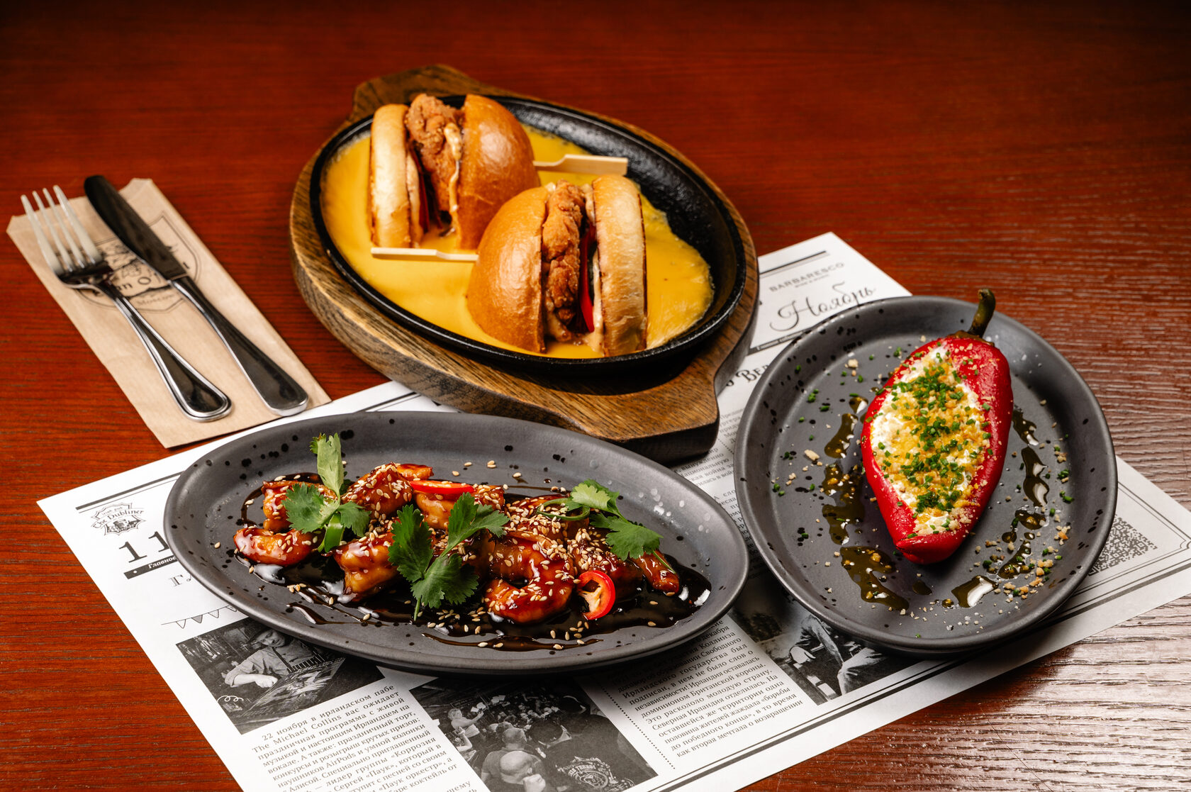 Бургер “Крем Чиз” — нежный, сочный и по-настоящему уютный. Креветки терияки — ароматные, в сладковато-соленой глазури. Перец Рамиро с творожным сыром — лёгкая зимняя закуска с ярким вкусом.